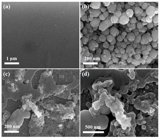 FESEM images of stepwise fabrication of electrode at different magnifications: (a) Bare (at 1 μm), (b) SnNPs (at 200 nm), (c) AptMDMA@SnNPs (at 200 nm), and (d) AptMDMA@SnNPs (at 500 nm).