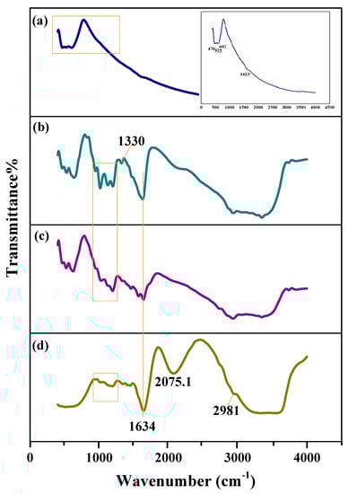 Fourier Transform Infrared Spectroscopy (FTIR) (500–4000 cm−1) spectra of electrode modification: (a) SnNPs. Inset shows FTIR spectra in the range of 400–1500 cm−1. (b) Cys@SnNPs, (c) Glu@Cys@SnNPs, and (d) AptMDMA@Glu@Cys@SnNPs.
