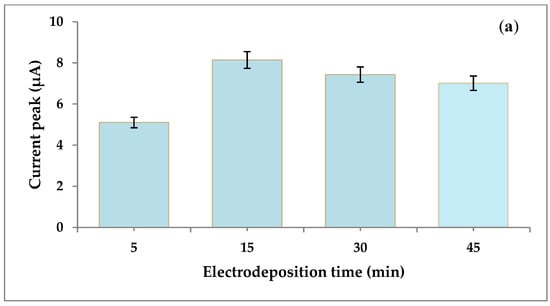 To improve the sensitivity and performance of the aptasensor, the electrochemical responses of SnNPs@Au were evaluated as a function of various parameters that are expected to affect its performance. First, the deposition time of SnNPs could significantly influence the conductivity of the sensor, as a prolonged time of SnNPs electrodeposition can potentially deform the fabricated layers due to clumping []. Additionally, the multi-layer formation of nanomaterials on the electrode surface via electrochemical nucleation and growth decreases the electrochemical reactivity of the sensor []. Therefore, the electrochemical responses of SnNPs@Au were measured after the electrodeposition of SnNPs for 5, 15, 30, and 45 min. As shown in Figure 8a, the peak current in DPV was highest for electrodes fabricated with 15 min of electrodeposition in comparison to 30 and 45 min electrodeposition. We suspect that the longer times of SnNPs deposition may promote dense surface clustering that modestly inhibits electron exchange between the electrode and the solution.