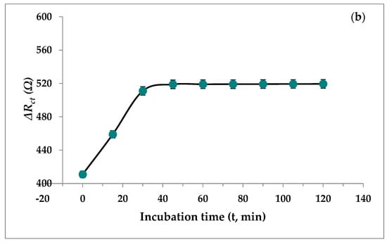 The incubation time of the MDMA sensor was also optimized by allowing the target MDMA to bind with the AptMDMA/SnNPs@Au electrode for 5, 15, 30, 45, 60, 75, 90, 105, or 120 min. Then, PEIS was performed in the frequency range of 1.0 MHz–500 mHz in 5.0 mM [Fe(CN)6]3−/4− electrolyte in a 0.1 M KCl solution. The aptasensor was regenerated after each step of target binding by rinsing with 6.0 M urea solution with continuous stirring for 10 min at 35 °C.