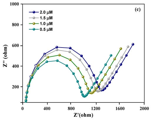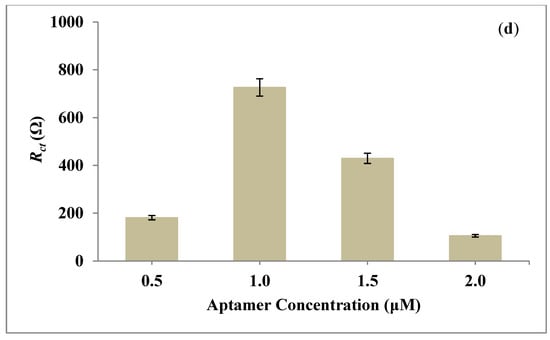 The incubation time of the target with the AptMDMA/SnNPs@Au electrode was also evaluated by incubating MDMA with the electrode for 5–120 min. As illustrated in Figure 8b, the ΔRct values increased with time from 0 to 30 min and then held steady at longer times. Therefore, 30 min was considered the optimum incubation time in the current study. To evaluate the effect of AptMDMA concentration on the sensitivity of the modified electrode, aptamer densities on the surface were calculated following the method reported by Liu et al. []. In the presence of 0.5, 1.0, 1.5, and 2.0 μM AptMDMA, the surface densities of the aptamer were estimated to be (3.16 ± 0.17), (680 ± 360), (840 ± 110), and (900 ± 130) × 109 molecules/cm2, respectively. As illustrated in Figure 8c, the Rct values increased with increasing AptMDMA concentration (AptMDMA probe density), which indicates a large quantity of negatively charged AptMDMA on the surface. ΔRct value was the maximum for the 1.0 μM AptMDMA/SnNPs-modified electrode, with a lower signal for 1.5 μM AptMDMA and little or no electrochemical response for 0.5 and 2.0 μM AptMDMA (Figure 8d). Therefore, we selected 1.0 μM AptMDMA in our study for further aptasensor development.