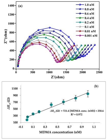 Performance analysis of AptMDMA/SnNPs@Au electrode at different (±)-3,4-Methylenedioxymethamphetamine (MDMA) concentrations. (a) Change in charge transfer resistance (ΔRct) at MDMA concentrations of 0.001, 0.01, 0.1, 0.2, 0.4, 0.6, 0.8, and 1.0 nM. Analyses were carried out in 5.0 mM [Fe(CN)6]3−/4− and 0.1 M KCl electrolyte. (b) Calibration curves between ΔRct and different MDMA concentrations.
