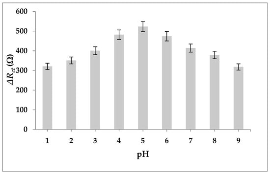 To evaluate the effective pH for the efficient function of the aptasensor, PEIS data were recorded for the AptMDMA/SnNPs@Au electrode in the presence of 0.33 nM MDMA in phosphate buffer at pH values ranging from 5.5–9.5. As shown in Figure 10, the aptasensor exhibited the highest impedance at pH 7.5, which indicates efficient functioning of the AptMDMA/SnNPs@Au electrode near physiological pH; real-world measurements should include the pH adjustment of biological samples such as urine to approximately pH 7.5 to maximize sensitivity.