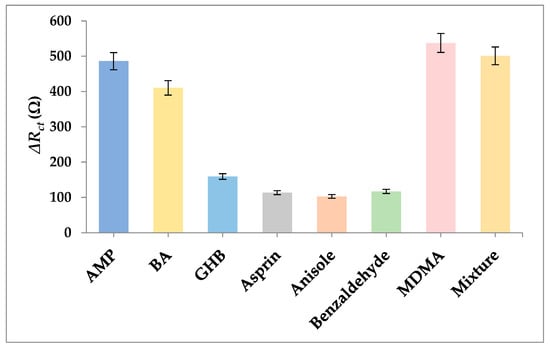 To assess the specificity of the aptasensor for MDMA detection, ΔRct was measured for potential interferents: AMP, GHB, aspirin, anisole, BA, and benzaldehyde, each at 0.33 nM. As illustrated in Figure 12, most of these potential interferents did not significantly perturb responses in comparison to the result obtained from MDMA. The single exception was AMP, whose chemical similarity to MDMA limits the selective detection of one compound to the exclusion of the other. The unavailability of potential major interfering recreational drugs, such as cocaine and ATS compounds such as heroin, preclude the evaluation of the selectivity of the aptasensor developed in our study with respect to these compounds. Moreover, the PEIS signal of the interferent mixture with MDMA was also similar to the current obtained in the presence of only MDMA, which indicates the potential selectivity of MDMA detection.