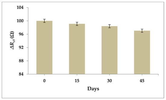 The long-term stability of the aptasensor was evaluated by a storage assay, in which our sensor was stored at (4 ± 0.1) °C for 15 days, after which it retained 97% of its initial response (Figure 13). Furthermore, the impedimetric responses of AptMDMA/SnNPs@Au in the presence of 0.33 nM MDMA were recorded for intra- and inter-batch studies, which confirmed the high reproducibility of the sensor with RSD% of 1.7% and <2.4%, respectively (Table 3). Thus, the experimental results suggest the acceptable selectivity, stability, and reproducibility of the aptasensor.