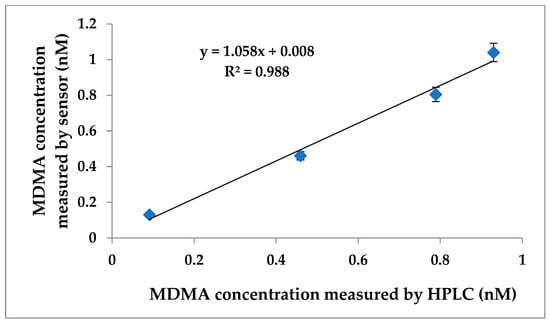 Finally, to demonstrate the utility of the aptasensor on complex samples, the aptasensor performance was evaluated on water and urine/ blood samples spiked with 0.1, 0.4, 0.7, or 1.0 nM of the MDMA analyte. PEIS measurements were carried out to evaluate signal recoveries and RSD% from the spiked samples, and the results are summarized in Table 4. The ΔRct values before and after the addition of different concentrations of MDMA in real samples are close to the corresponding ΔRct values in pure MDMA solution with the same concentrations. As exhibited in Table 4, the MDMA concentration recoveries ranged from 92–96.7%, 91–103%, and 87–90% for spiked urine, blood, and water samples, respectively with RSD values of 1.1–2.2% and 1.37–2.12% for urine and blood samples respectively. Additionally, a correlation study on the developed aptasensor also exhibited a high correlation (R2 = 0.98) with conventional HPLC (Figure 14). The excellent recovery percentages with low RSD values of the sensor suggest that the aptasensor developed here has good repeatability in real samples with potential application in forensic science.