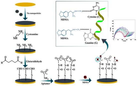In this work, a novel electrochemical aptasensor was constructed for MDMA detection, as illustrated in the Scheme 1. Oxidized SnNPs were prepared and then electrochemically deposited onto the gold electrode. This approach combines the advantages of a high surface area for more aptamer deposition and an excellent electrochemical response to the target analyte [,,]. Fabricated SnNPs were further functionalized with Cys to provide an NH2 group on the surface that reacts with the carboxylic group of Glu and ultimately provides a binding site for amino-functionalized AptMDMA. AptMDMA can anchor to the large surface area of the SnNPs-modified electrode through covalent attachment [,]. Based on extensive precedent from other aptamers, it is presumed that the AptMDMA strands will change their conformation and flexibility upon noncovalently binding with MDMA. The conformational changes of aptamers are expected to alter the accessibility of the electrode surface, thereby affecting the current flow []. This ultimately results in reduced electron transfer between the modified electrode and electrolyte solution, which is the major determining factor in electrochemical sensing technologies.