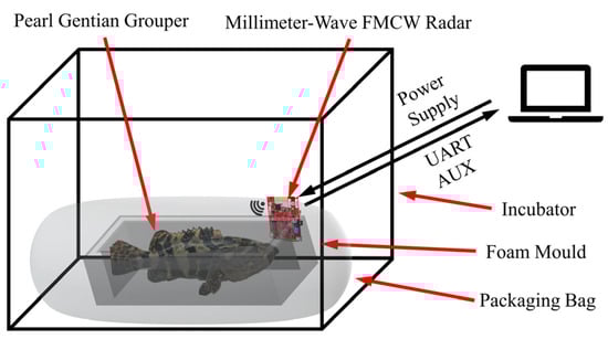The NDBRMS consists of the computer, the millimeter wave radar AWR1642 BOOST (Dallas, TX, USA), the waterless live transportation system, and the data processing program. The groupers that were in a low-temperature waterless live transportation environment are monitored by the NDBRMS. The schematic view of the NDBRMS is shown in Figure 2.