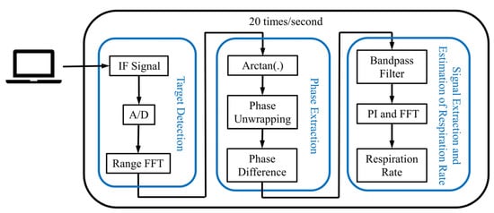 At present, the application of pulsed radar, Doppler radar, and frequency-modulated continuous-wave (FMCW) radar in the measurement of the respiration rate mainly focuses on the human body [13,14,15]. The FMCW radar, as opposed to pulse radar and Doppler radar, can detect the distance to target and Doppler information at the same time, and has become the standard in the field of breathing monitoring [16]. Higher frequency electromagnetic waves may also increase the phase modulation sensitivity in millimeter wave radar breath-detection devices [17].