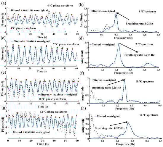 Breathing signal filtering and PI in preliminary experiments. (a) Breathing signal phase waveform at 4 °C; (b) Breathing signal spectrum at 4 °C; (c) Breathing signal phase waveform at 7 °C; (d) Breathing signal spectrum at 7 °C; (e) Breathing signal phase waveform at 10 °C; (f) Breathing signal spectrum at 10 °C; (g) Breathing signal phase waveform at 12 °C; (h) Breathing signal spectrum at 12 °C. The blue solid line represents the filtered, the black dashed line represents the measured original and the red stars represent the local maximum used to calculate the respiration rate.