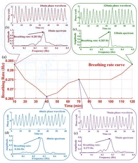 (a) Two-hour ‘normal’ breathing rate change curve; (b) Breathing signal phase waveform and its spectrum at 10 min; (c) Breathing signal phase waveform and its spectrum at 120 min; (d) Breathing signal phase waveform and its spectrum at 40 min; (e) Breathing signal phase waveform and its spectrum at 70 min.