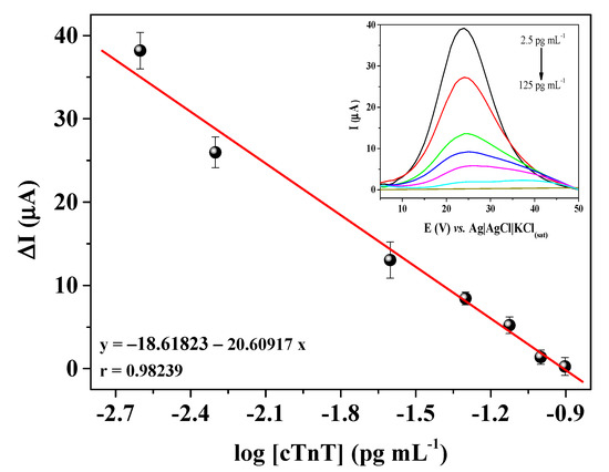 The calibration curve for cTnT was obtained by using a label-free assay, i.e., without a secondary antibody labeled with a redox species. The principle of the assay was based on minimizing the electron transfer kinetics of the redox probe obtained from the Faradaic process at the sensor interface, due to the insulating nature of the antigen. To build the calibration curve, the immunosensor was incubated with different concentrations (2.5, 5, 25, 50, 75, 100, and 125 pg mL−1) of cTnT solutions prepared in 0.01 mol L−1 PBS solution at a pH of 7.4. Then the immunosensor was submitted to SWV measurements in 0.1 mol L−1 KCl solution containing 5 mmol L−1 [Fe(CN)6]3−/4−. The results showed a proportional decrease of the current in relation to cTnT concentrations (Figure 6). A linear relationship was found between the immunosensor response (current) and the logarithmic of the cTnT concentration in the range from 2.5 to 125 pg mL−1, with the linear regression equation ΔI = −18.618 − 20.609*[cTnT], showing a correlation coefficient of 0.98239 and coefficient of variation (CV) of 7.5%. The logarithmic scale was used to linearize the calibration curve, since a concentration range with two different orders of magnitude was used. The sensibility of the immunosensor was determined by calculating the limit of detection (LOD) and the limit of quantification (LOQ) according to the IUPAC definition [32]. The LOD and LOQ of the proposed cTnT immunosensor were estimated in 0.70 pg mL−1 and 2.10 pg mL−1, respectively.