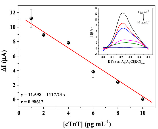 First, the serum dilution was analyzed by comparing the current intensity between serum in the absence and presence of cTnT. In this study, the serum was spiked with 50 pg mL−1 cTnT. The following dilutions were studied: 1:50; 1:25; 1:12,25; 1:8,33; 1:6,25; and 1:5. The results are shown in Supplementary Figure S3. All studied dilutions presented a significant difference between serum with and without cTnT, with current intensity about 2-fold higher for the spiked sample, which shows that the immunosensor response was not affected by the serum matrix. The 1:5 dilution can be highlighted because the difference was slightly bigger (2.2-fold), and the current intensity was higher than the other dilutions, which improves the sensibility of the immunosensor. Thus, the calibration curve in spiked serum was performed by using a dilution of 1:5. Then a serum without cTnT was contaminated with cTnT in the concentration range of 1.0–10 pg mL−1 (Figure 7). The immunosensor presented a linear response in the studied concentration range, with a linear regression equation equal to ΔI = 11.598 − 1117,73*[cTnT] and a correlation coefficient of 0.98612. The LOD and LOQ of the proposed cTnT immunosensor in a serum sample were estimated to be 0.35 and 1.05 pg mL−1, respectively. These limits are lower than the clinical levels, which may contribute to the early diagnosis of cTnT in patients after the first hours of infarction symptoms.