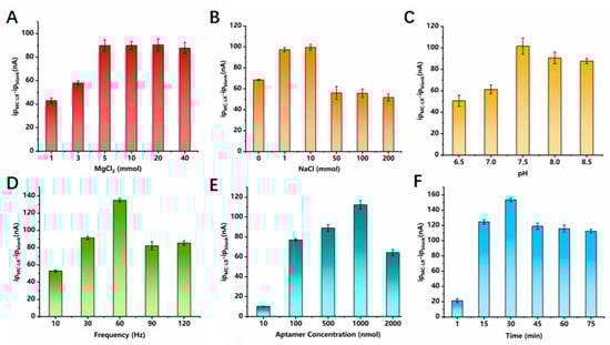 Optimization of the experimental conditions: (A) MgCl2 concentration; (B) NaCl concentration; (C) pH value; (D) frequency; (E) aptamer concentration; (F) modification time. All conditions were tested with 100 ng/L MC−LR.
