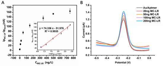 CV was utilized to analyze the response of the sensor to MC-LR under optimal conditions. Figure S1 displays the CV of the bare Au sensor in a 20 mM Tris-HCl buffered solution. A well-defined MB peak was observed at around −0.25 V (vs. Ag/AgCl, i.e., without MC-LR), verifying the successful modification of the aptamer (Figure S2A). MB current increased significantly when MC-LR was added, indicating that the optimum sensor responses to MC-LR (Figure S2B). The addition of MC-LR has led to the formation of folded aptamer, which is consistent with our proposed sensing mechanism.