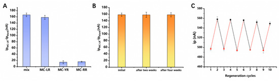 Besides MC-LR, Microcystis aeruginosa also produces other MCs, namely MC-YR and MC-RR. Due to the similarity in the structure and molecular weight of the MC homologs, the separation of MCs is challenging [22]. The electrochemical sensors constructed with aptamers as recognition receptors produce different electrochemical responses to different homologs of MC. Therefore, the E-AB sensor constructed using the selected aptamer allows for sensitive detection of MC homologs. Responses of this sensor to other MCs, including MC-RR and MC-YR, were systematically evaluated (Figure 5A). The results demonstrate that this method allows for accurate measurement of MC-LR with good anti-interference ability in the presence of other MC homologs. In addition, the results prove the specificity of the aptamer toward MC-LR as no recognition response to other MC homologs was recorded.