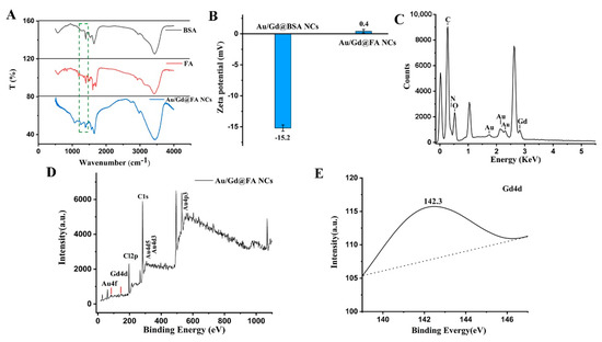 (A) FT-IR spectra of BAS, FA, and Au/Gd@FA NCs. (B) Zeta potential of Au/Gd@BAS NCs and Au/Gd@FA NCs. (C) EDS spectrum of Au/Gd@FA NCs. (D) Full-range XPS spectrum of Au/Gd@FA NCs. (E) Gd4d specific binding energies of Au/Gd@FA NCs.
