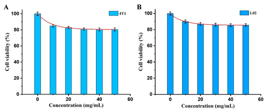 The cell viability of 4T1 cells (A) and L02 cells (B) was incubated with Au/Gd@FA NCs for 24 h. Error bars indicate the standard variance of three independent experiments. Data represent the means ± SD (n = 3).