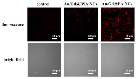 In addition, the fluorescent probes used for the assay have excellent fluorescence properties and good biocompatibility, and can also effectively distinguish tumor cells from normal cells, with accurate targeting properties. Therefore, we further investigated the selectivity of Au/Gd@FA NCs for tumor cells and normal cells. Confocal microscopic imaging results showed that the same concentration of Au/Gd@FA NCs did not observe a significant fluorescence signal in normal cells (L02), while a bright red fluorescence signal was observed in 4T1 cells (Figure S2). It was further shown that Au/Gd@FA NCs had a strong specific preference for tumor cells, and confirmed that the uptake of Au/Gd@FA NCs by tumor cells could be significantly increased by modifying FA molecules, and could accumulate in the cytoplasm. This result was confirmed by ICP-MS.
