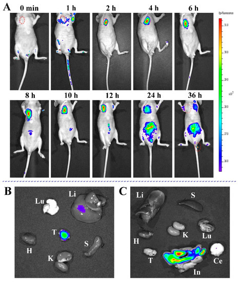 (A) In vivo near-infrared fluorescence images of 4T1 tumor-bearing nude mice by intravenous injection of Au/Gd@FA NCs at 0, 1, 2, 4, 6, 8, 10, 12, 24, and 36 h (Eex = 460 nm, Eem = 690 nm). (Tumor is indicated with a red dotted ellipse; stool is marked with a bold red circle). (B) The mice were sacrificed after injection for 8 h, the tumor (T, tumor), and major organs (Li, liver; K, kidney; S, spleen; Lu, lung; H, heart) for FL imaging ex vivo. (C) After injection for 36 h, the tumor (T, tumor) and major organs (Li, liver; K, kidney; S, spleen; Lu, lung; H, heart; In, intestine; Ce, cerebrum) for FL imaging ex vivo.