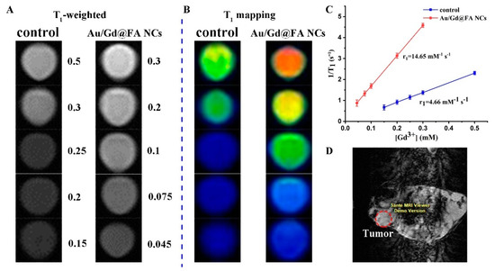 Au/Gd@FA NCs have successfully achieved accurate near-infrared FL imaging of tumors at the cellular and in vivo levels due to their stable near-infrared fluorescence properties and good targeting. In addition, Au/Gd@FA NCs contain a small amount of Gd and have good paramagnetic properties for MRI. Therefore, we explored the possibility of Au/Gd@FA NCs as MRI contrast agents. First, we compared the nuclear magnetic properties of the prepared Au/Gd@FA NCs with those of a commercial MRI contrast agent, Gd-diethylenetriamine pentaacetic gadolinium (Gd-DTPA), to evaluate its potential application in MRI. As can be seen from the T1-weighted MRI images in Figure 6A,B, the signal intensity is still much higher than that of the high concentration Gd-DTPA contrast agent even at a low concentration of Au/Gd@FA NCs [40]. The longitudinal proton relaxation time T1 was measured and the corresponding Gd3+ concentration in Au/Gd@FA NCs probes was measured by ICP-MS. The relaxation value r1 was determined by plotting these two values with a function. The results showed that the r1 value of Au/Gd@FA NCs was 14.65 mM−1 S−1 (Gd) at 1.5 T, which was 3-fold higher than that of Gd-DTPA (Figure 6C). Furthermore, it can be concluded that Au/Gd@FA NCs have excellent T1 imaging ability. The excellent performance of Au/Gd@FA NCs as MRI contrast agents in vitro prompted us to further explore their feasibility in vivo. After 200 μL Au/Gd@FA NCs (100 μg/mL) were injected intravenously into tumor-bearing mice for 8 h, the nude mice were examined by T1-weighted MRI. As shown in Figure 6D, on the T1-weighted MRI images, it was observed that the brightness of the tumor site was significantly higher than that of other normal tissues, which could effectively distinguish the lesion site and achieve MRI images of the tumor. The results confirm that Au/Gd@FA NCs can be used as a potential T1-weighted MRI contrast agent.