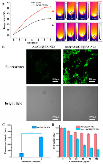 In vivo FL imaging and MRI studies, Au/Gd@FA NCs have been found to be actively enriched at the tumor site. Due to the strong SPR absorption band of gold-based nanoparticles, Au/Gd@FA NCs enriched in large amounts at tumor sites are highly susceptible to heat generation under light due to the strong SPR effect, which affects the physiological metabolism of tumor cells. Under laser irradiation at 660 nm (1.2 W/cm2), the temperature of Au/Gd@FA NCs solution (60 μg/mL) increased from 21 °C to 46.1 °C within 6 min, while PBS as the control group only increased to 35.4 °C (Figure 7A). The results indicate that Au/Gd@FA NCs solution can convert light energy into heat energy under laser irradiation and has some photothermal conversion ability. In addition, we investigated the changes of ROS in tumor cells after co-incubation with Au/Gd@FA NCs under laser irradiation. The generation of ROS in cells was detected using the sensitive fluorescent dye DCFH-DA, and the fluorescence intensity was proportional to the generation of ROS. Au/Gd@FA NCs (60 μg/mL) were co-incubated with 4T1 cells for 8 h, and then DCFH-DA solution was added for further incubation for 45 min, and the fluorescence intensity was observed under the confocal fluorescence microscope. As shown in Figure 7B, after 660 nm (1.2 W/cm2) laser irradiation for 6 min, the 4T1 cells showed clear green fluorescence, indicating that a large amount of ROS was produced in the cells. However, there was only a weak fluorescence signal in the non-irradiated group, indicating that the ROS content in the cells was low. The fluorescence intensity in the laser irradiation group was 5.3 times higher than that of the non-irradiated group (Figure 7C). This indicated that Au/Gd@FA NCs could generate a large amount of ROS in tumor cells under light irradiation, which might be due to the enhanced interaction between bipolar FA molecules and plasma field Au/Gd@BSA NCs [41].