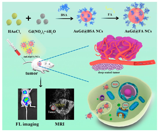 The rapid development of nanomedicine has provided new solutions for the diagnosis and treatment of diseases. In particular, the construction of multi-functional nanoprobes can meet the needs of multiple functions at the same time and realize applications in biomedical fields, such as multi-mode imaging, integration of diagnosis and treatment, visual monitoring, and others [1,2,3]. Multimodal imaging [4,5,6,7] can effectively overcome the inherent limitations of a single modality, such as fluorescence (FL) imaging, magnetic resonance imaging (MRI), and computed tomography (CT), and organically combine two or more imaging modalities to meet the requirements of accurate and fast imaging in clinical diagnosis. FL/MRI imaging [8,9,10] can not only improve the imaging detection depth and spatial resolution by using MRI but also greatly improve the sensitivity of FL imaging, which can provide relevant information at the cellular level and even guide surgical resection of the tumors in clinical practice, which is a dual-modal imaging technology with broad clinical application prospects. Currently, the FL/MRI dual-mode molecular probes provide two signals simultaneously by organically combining gold-based nanomaterials [11,12], carbon-based nanoparticles [13,14], upconversion nanoparticles [15,16], iron oxide/iron trioxide nanoparticles [17,18], gadolinium chelates [19,20], and other materials. These near-infrared fluorescent probes [21,22] can effectively avoid the interference of the autofluorescence of organisms and greatly improve the detection depth (up to several centimeters), which is more promising for biomedical and clinical applications. Compared with other near-infrared fluorescent probes, gold-based nanoparticles are widely used as probes due to their good biocompatibility, controllable morphology and size, surface modification, and stable fluorescence properties.
