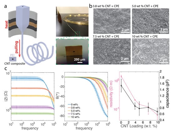 To obtain the electrical impedance, the thermally drawn fiber with CNT composite was cut into sections with the length of 3 cm, and the cross-sectional size of the CNT composite electrode was measured under an optical microscope. Then, conductive silver paint (SPI supplies) was applied on both ends to improve the surface contact and later was connected to copper wire to facilitate the electrical connection. Electrical impedance measurement was then performed using a potentiostat (Gamry Interface 1010E, Gamry Instruments Inc., Warminster, PA, USA) in the impedance analyzer mode between both ends of the fiber. A sinusoidal voltage with amplitude of 10 mV in the frequency range from 10 Hz to 100 kHz was applied between the two ends of the fiber, and the resulting alternating current was recorded, from which the electrical impedance of the CNT composite within the fiber was determined. Later, the electrical impedance results were analyzed via the Gamry software where we fitted the electrical impedance spectrum with the simple circuit model of resistance and capacitance in parallel. Again we could calculate the resistivity via following the Pouillet’s law, given the known length and area of the fiber. These analysis indicates both the resistive and the capacitive components in the fibers with CNT composite electrodes (