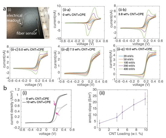 The electrochemical performance of the CNT composite fibers were first characterized in 1 mM ferrocenemethanol (FcMeOH) dissolved in phosphate buffered saline solutions (PBS). The cyclic voltammetry measurements were performed using a potentiostat (Gamry Interface 1010E, Gamry Instruments Inc., Warminster, PA, USA), adopting the schemes of three-electrode configuration. The samples are connected to the working electrode, a glass-type Ag/AgCl reference (3M KCl, Basi) was used as the reference electrode, and a Pt wire was used as a counter electrode. The scanning rate of the cyclic voltammetry for FcMeOH solution was set from −0.5 V to 0.5 V with the varied scanning speed of 20 mV/s, 50 mV/s, 100 mV/s, 200 mV/s and 400 mV/s. From the CV results, the electrochemical reaction speed at the surface of the composite fiber was characterized via the slope of rising of anodic current at scanning speed of 20 mV/s (