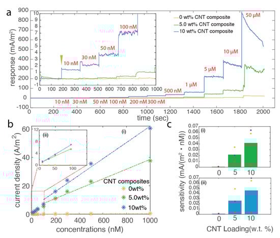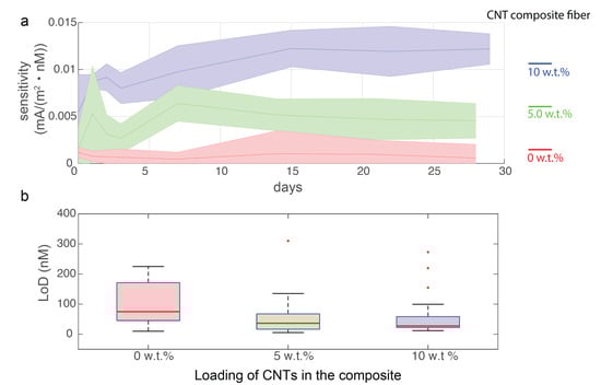 20]. We have shown that down to 10 nM of DA can be reliably recorded via our fiber in in vitro settings without requiring any surface enhancement. In addition, we carried out the long-term experiments and incubated the fiber sensors in settings which mimic the in vivo or sweat environment with regulated temperature and ion composition. The sensitivity change over months was evaluated, which showed that there were no clear signs of sensing degradation in CNT-reinforced nanocomposite fibers over one month, whereas the pure carbon black based ones reached its lifetime at 2–3 weeks due to poor interfacial interactions of the nanofiller with the host polymer matrix.