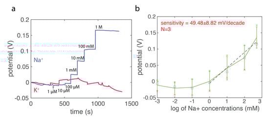 concentration with a relatively high average sensitivity of 49.48 ± 8.82 mV/decades, which shows no response to K