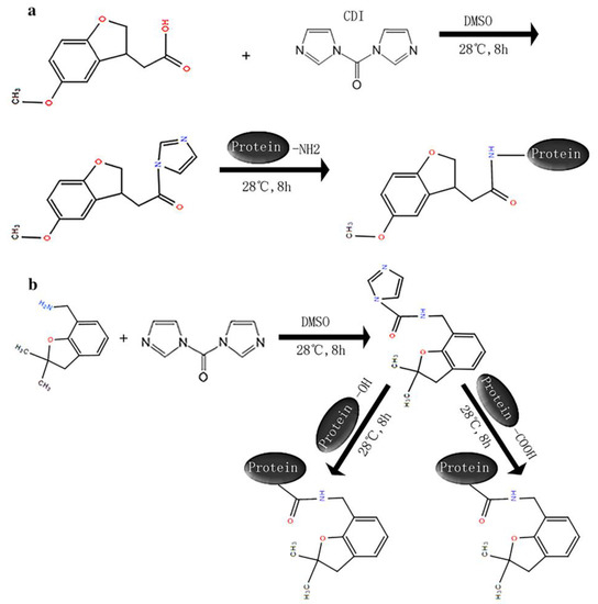 The synthetic routes for the immunogen and coating antigen. (a) Conjugation progress of hapten MDA to carrier protein (b) Conjugation progress of hapten DDB to carrier protein.