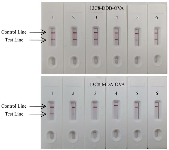 An immunochromatographic test strip consisted of a sample pad, a conjugate pad, a nitrocellulose (NC) membrane and an absorbent pad. The mAb–colloidal gold conjugates (700 μL) were sprayed onto the conjugate pad (6 mm × 300 mm) and then dried under vacuum for 20 h at room temperature. DDB-OVA (50 μg/mL) or MDA-OVA (30 μg/mL) and goat anti-mouse IgG antibodies were dispensed on the NC membrane at a rate of 1 μL/cm as the test line (T line) and control line (C line), respectively. The NC membrane was then dried at 37 °C for 3 h. The sample pads, conjugate pads, NC membranes and absorbent pads were attached to the PVC plastic support, and then the assembled plate was cut to obtain 4 mm test strips and placed in a rigid plastic cassette.