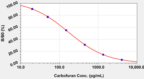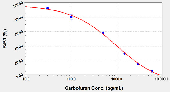 Taking the logarithm of the carbofuran concentration as the abscissa and (B/B0)% as the ordinate, the standard curves for ELISA and QD-LFIA were obtained based on the Morgan–Mercer–Flodin (MMF) model, which were fitted by CurveExpert 1.4.0 software (https://www.curveexpert.net, accessed on 15 July 2022). For the ELISA method, B and B0 are the absorbance of the sample well and blank well, respectively. For the QD-LFIA method, B and B0 are the T/C (fluorescence intensity of the test line/fluorescence intensity of the control line) of the sample and blank control, respectively.