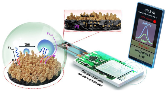 In this work, a portable electrochemical aptasensing platform is developed for the point-of-care detection of tau protein in the blood. In this electrochemical sensing system, vertical graphene (VG) modified with nanoAu (VG@Au) is used as an electrode material because of its large specific surface area, excellent electrical conductivity, high carrier mobility, good chemical stability, and outstanding biocompatibility [32,33], which improves sensitivity and reduces detection limit. In addition, nanoAu is also used to bind with aptamer. As shown in Figure 1, the entire electrochemical aptasensing system consists of an electrochemical micro-workstation (control system, size: 2 cm × 1 cm × 0.5 cm), a paper-based three-electrode sensing system (size: 2 cm × 0.7 cm × 0.1 cm), and a smartphone (results output system). The electrochemical micro-workstation is used for signal control, which connects to the smartphone by Bluetooth. The result is shown in BioSYS APP. The internal structure of the electrochemical micro-workstation is displayed in Figure 1, and the detail is shown in our previous paper [16]. The DNA aptamer of the tau protein was immobilized on the surface of VG@Au by Au-S. When the tau protein binds with aptamer, the spatial structure of DNA aptamer changes, hindering the electron transfer on the electrode surface. During this process, the peak current of the differential pulse voltammetry (DPV) is reduced. The concentration of the tau protein could be determined by measuring the DPV peak current changes. This sensing platform exhibits a low detection limit of 0.034 pg/mL and a wide linear range of 0.1 pg/mL–1.0 ng/mL. This portable VG@Au-based electrochemical sensing platform shows tremendous potential for AD diagnosis at home and in personal healthcare.