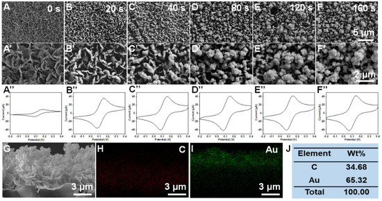 Effect of deposition time on the morphology and electrochemical performance of VG@Au. SEM images of VGs modified with nano Au at different deposition time (A,A’) 0 s; (B,B’) 20 s; (C,C’) 40 s; (D,D’) 80 s; (E,E’) 120 s; (F,F’) 160 s. (A’’–F’’) are the corresponding CV curves of figure (A–F). The cross-section view morphology (G) and corresponding element distribution characterization (H–J) of VG@Au at deposition time of 80 s.