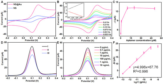 The analytical performance of the portable VG@Au-based electrochemical aptasensing platform for point-of-care detection of tau protein. (A) A electro-active area comparison (CVs) of VG and VG@Au electrode in 5 mM (Fe(CN)6)3−/(Fe(CN)6)4− solution containing 0.1 M KCl at 0.01 V/s. (B) CVs of VG@Au electrode at different scan rates. The inset is the relationship between peak current and the square root of scan rate. (C)The optimization of DNA aptamer. (D) DPV signals of VG@Au (line I), VG@Au + aptamer (line II), VG@Au + aptamer + MCH (line III). (E) DPV signals of different concentration tau protein in 5 mM (Fe(CN)6)3−/(Fe(CN)6)4− solution containing 0.1 M KCl at 0.01 V/s. (F) The corresponding calibration curve of figure (E).