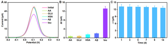 The selectivity and stability were also investigated. As shown in Figure 4A,B, when 10 pg/mL tau protein was added, the DPV signal decreased significantly. However, when 1000-fold AA, GLU, HAS, or Aβ were added, there as little change in DPV signals, indicating that this sensing system had an outstanding selectivity. What is more, the stability of this electrochemical sensing platform based on VG@Au was evaluated by multiple tests of 10 pg/mL tau protein, and the result is shown in Figure 4C. After 14 days, the ΔI remained above 90% of its original level, which demonstrated that this portable electrochemical aptasensing platform based on VG@Au had excellent stability.