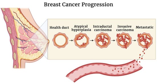 Breast cancer is mostly derived from abnormalities in the epithelium (carcinoma), and it encompasses a group of injuries that differ in microscopic aspects and biological behavior. The natural evolvement of breast cancer consists of the progression from non-invasive forms (in situ), in which tumor cells are limited to ducts or lobules, to invasive forms characterized by the spread to the breast stroma and, lastly, to metastatic carcinomas when the tumor spreads to distant sites. Non-invasive carcinoma can be ductal in situ or lobular in situ. Ductal carcinoma in situ (DCIS) is the most common form of non-invasive carcinoma, often associated with recidivism and progression to the invasive form known as invasive ductal carcinoma. Invasive ductal carcinoma, also known as infiltrating ductal carcinoma, is the most common type of breast cancer [,,]. A schematic representation of breast cancer progression is reported in Figure 1.
