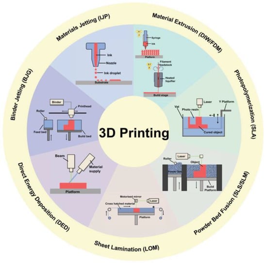 AM encompasses a group of technologies that allow the production of complex objects in a layered fashion using computer-aided control []. Three-dimensional printing technologies are classified into seven categories (illustrated in Figure 2): material extrusion, binder jetting, photopolymerization, material jetting, powder bed fusion, sheet lamination, and directed energy deposition []. Table 2 reports, for each category, the techniques included, a brief description of the printing process, and their strengths and weaknesses [].