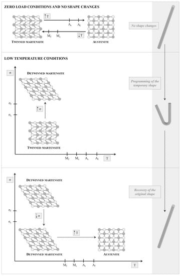The shape memory effect for alloys is based on the reversible transformation between two crystalline phases: austenite and martensite, each of which is characterized by distinctive characteristics. The austenitic phase presents a cubic structure; while the martensitic structure varies according to the alloy composition (e.g., tetragonal, orthorhombic, or monoclinic structure). Moreover, different martensitic orientations can be observed, which are called variants. If one variant prevails, the martensite is called “detwinned”, whereas if combinations of variants coexist, it will be called twinned martensite. The shape memory effect is mainly activated by heat. The austenitic phase represents the initial phase that is subject to deformation upon cooling at the martensitic start temperature (Ms) and will be fully transformed to twinned martensite at the martensitic finish temperature (Mf). The recovery to austenite is initiated at the austenitic start temperature (As) and will take place at the austenitic finish temperature (Af). Moreover, when sufficient stress is applied to the martensitic phase, the detwinning process can occur, resulting in temporary deformation of the orientations (Figure 3). The detwinned orientation can be preserved even when the stress is released. Currently, the most investigated alloys are copper, nitinol-titanium (NiTi), iron, and their combination with other materials. Among them, NiTi systems are the most explored, because of the better biocompatibility, good processability, and good properties, such as the high actuation stress and recoverable strain. However, due to their complex production, high cost, potential toxicity, and limited recovery, other materials are preferred over alloys [,,].