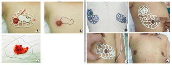 Breast and tumor prototypes are key instruments used for different purposes, including diagnostic tasks, surgery training, preoperative planning, treatment optimization, and drug screening. Three-dimensional-printed physical phantoms are employed to mimic the patient’s anatomy, both from the external and internal perspectives, allowing the evaluation and optimization of imaging techniques [,]. In addition, they can be useful to predict the dose distribution for safe and effective radiotherapy treatments []. Three-dimensional-printed models can additionally help surgeons to plan and make decisions, as well as be employed for training activities or to increase the efficacy of patient communication []. From a practical perspective, 3DP tumor models were developed to localize the tumor, providing a physical model of the area in order to facilitate and guide the resection. For this purpose, breast images are fundamental to acquiring necessary information enabling the production of an accurate design. Wu et al. reported the application of MRI-based patient-specific 3DP surgical guides (Figure 5) for breast-conserving surgery in patients with ductal carcinoma in situ and invasive ductal carcinoma. In both case studies, the results suggested that surgery was successfully performed with clear margins [,].
