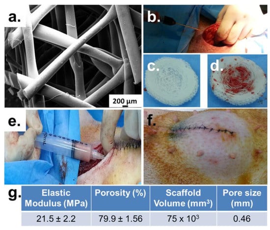Showing (a) structure of the scaffold; (b–f) implantation of the scaffold and fat injection process; and (g) scaffold’s properties [].