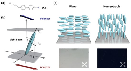 Among the different categories of thermotropic LCs, 4-cyano-4′-pentylbiphenyl (5CB) is the most commonly used component in LC-based sensing devices. This molecule contains a central biphenyl group and a cyano group, as depicted in Figure 1a. It has a stable nematic phase within 24 °C to 35 °C and enters an isotropic phase above the transition temperature TN-I = 35 °C. The nematic phase processes a high degree of orientational order, but no positional order. As shown in the schematic diagram in Figure 1, the LC molecules prefer to align along the same direction spontaneously, which can be expressed by a unit vector, n. The uniform direction leads to molecular anisotropy, the degree of which can be estimated by the order parameter, S: