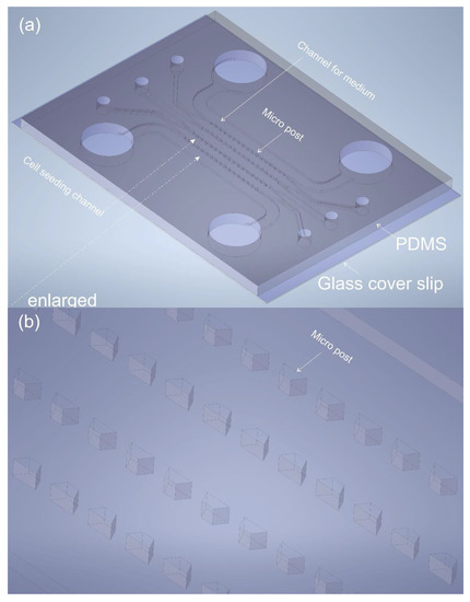 3D cell culturing in a microfluidic device has many advantages compared with conventional 2D culture methods on a flask or a Petri disk. Among the most beneficial aspects are the followings: (i) A cost reduction in the chemicals and cells used in the experiments since down-scaling into microscale. The use of chemical, biomaterial volume (e.g., media, cells) is in the order of 1 μL (or smaller) compared with mL in the conventional culture methods. (ii) The 3D structures of a microchannel offer a micro-environmental model closer to an in-vivo. (iii) Multicellular cultures and cell–cell communication are made possible. Over the past 15 years, many researchers have performed experiments on microfluidic cell seeding and culture for one cell type [1,2,3] and multiple cell types [4,5,6,7,8,9] to investigate cell–microenvironment interaction, cell–cell communication, cell migration, etc. The microfluidic chip designs in these studies have been inspiring for the current works performed in our group, such as the studies of pulmonary arterial hypertension (PAH)-on-a-chip [4]. The typical material for making the biochip in these works over many years is Polydimethylsiloxane (PDMS), and the typical design for the microfluidic components is as follows: there are one (for one cell type study) or multiple main micro-channels (for multicellular research). Each of the main channels comprises two parallel rows of regularly distributed micro-sized posts (shown in Figure 1) to separate one channel from another. The purpose of using micro-posts is to preserve some space for the cell growth medium to enter and also give rise to the observation of cell–cell communication and interaction. Even though these designs worked very well for cell studies with microfluidic chips made of PDMS, it is difficult to scale up the production of the chips and hence the commercialization. One of the reasons is that PDMS is expensive, and it is mostly impossible to scale up the massive production [10,11]. Another reason is that the geometries of these sharp-edge micro-posts in the previous works (trapezoid [4,8,12], hexagon [5]) can give rise to difficulty when using micromachining fabrication methods such as micro-milling [11]. Moreover, to the authors’ knowledge, the shape and spacing distance of the micro-posts together have not yet been optimized for the current reported work on the PAH-on-a-chip [4] and most of the other published works [5,6,12,13,14].