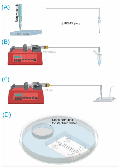 Schematics of: (A) Fabricating a PDMS plug used to connect a Cole-Parmer PTFE microbore tubing 0.012″ ID and a pipette tip. (B) Withdrawing cell suspension using a (New Era Pump) syringe pump and tubings. (C) Infusing cell suspension. (D) A tissue chip in a large petri dish containing a smaller petri dish having sterilized water acting as a humidifier for cell seeding in an incubator at 37 °C with 5% CO2. Figure partially made using Biorender.com.