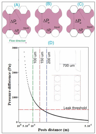 It can be seen from Figure 3D that for the microchannels with the width w = 700 μ, the spacing distance at 200 μm can result in leakage as the ΔP is below the threshold pressure (setting at 500 Pa for water, i.e., dynamic viscosity η = 10−3 Pa·s, density ρ = 103 Kg/m3 [5]).