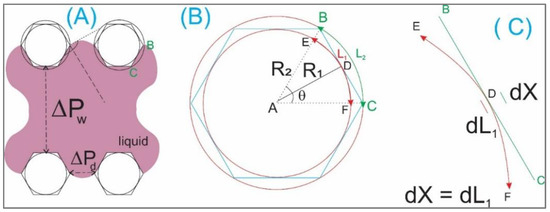 The length of the line BC (water contact line Figure 4A,B) has its value of x, we have the following.