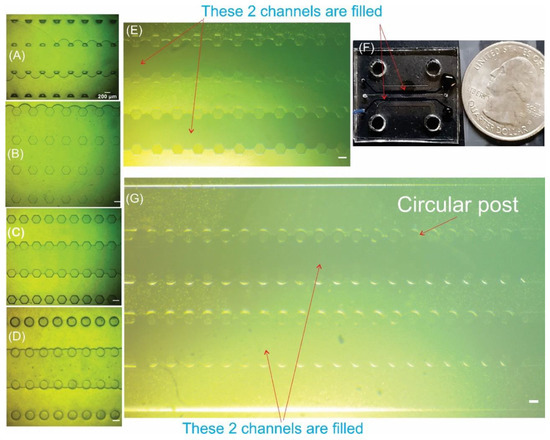 Microscope images of leakage from the middle channel to the neighboring compartments during liquid infusion using chips with 200 µm spacing distance for (A) trapezoidal posts and (B) hexagonal posts. Successful infusion of middle channels when using chips with 100 µm spacing distance for (C) hexagonal posts and (D) circular posts. Successful infusing multiple side channels for chips with 100 µm spacing distance for (E,F) hexagonal posts and (G) circular posts.