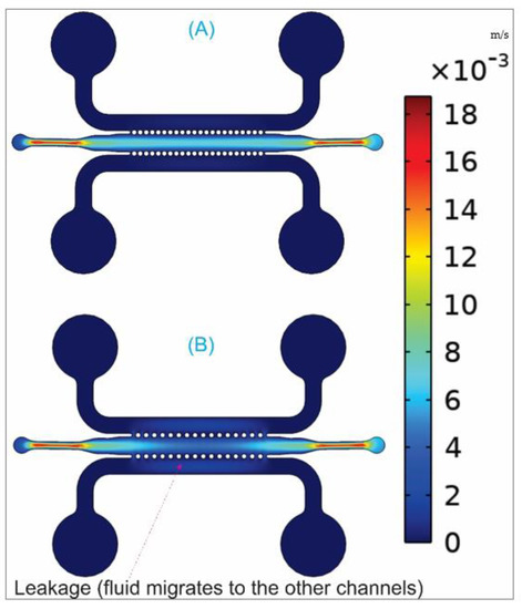 Figure 6 shows the velocity (m/s) patterns of the fluid flowing inside the microchannels made of circular micro-posts to simulate the leakage. The color legend presents the variety of fluid velocities starting from 0 m/s (blue color) and increasing to a maximum with red color.